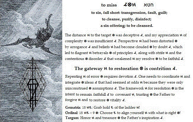 This illustration presents a definitions of the Hebrew word often translated as "sin." Meanings are derived from the alphabetical emblems as they appear in Torah’s original language. The wide application of the meanings is suggestive of the rich subtexts that open when, without denial of a word’s etymology, readers explore texts in the context of the language in which they were first written. The oracular script of Torah in its original form has many names in the world of men; but when read as the language of Torah, it is called Sinaitic Hebrew, which is comprised of the Phoenician alefbet that is known among many as the “Moses Script.” Traditional meanings are supported by the oracular senses of a word, but definitions are not limited by the window through which the traditions of man peek at the "words" of the infinite.